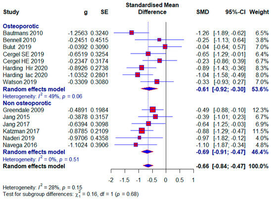 Six included studies conducted research with subjects who did not have osteoporosis, and there were a total of 344 (31.73%) subjects, of which 126 (36.63%) in the control group did not receive any treatment. A moderate effect size with statistical significance also appears in this subgroup (SMD = −0.69; 95% CI = −0.91, −0.47; p < 0.0001; GRADE: very low (Table 2) and heterogeneity (I2 = 0%, p = 0.51) (Figure 9).