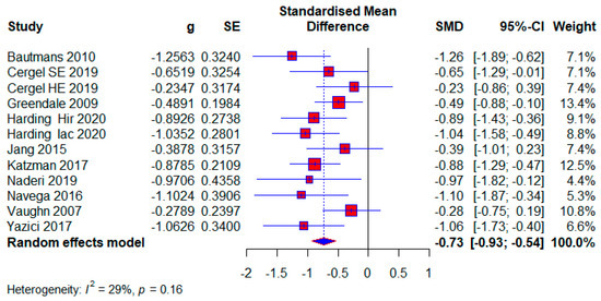 Ten studies used no treatment in the control group. They had a total of 592 (54.61%) respondents, of which there were 320 (54.05%) in the experimental group and 272 (45.95%) in the control group. The effect size is still within the limits of moderate: (SMD = −0.73; 95% CI = −0.93, −0.54; p < 0.0001; GRADE: low (Table 2) and heterogeneity (I2 = 29%, p = 0.16) (Figure 10).
