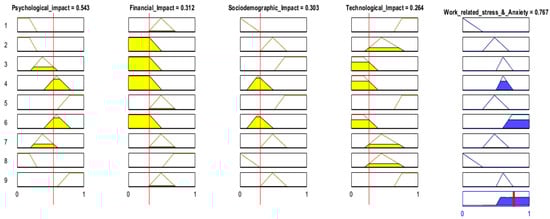 | Rule 1 | If (Psychological_impact is depressed) and (Financial_impact is deteriorating) and (Sociodemographic_impact is mild_associated) and (Technological _impact is negative) then (WRS and Anxiety is moderate high (0.767). | 0.76 |