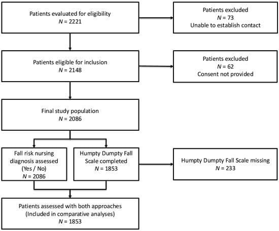 Flow diagram showing the number of pediatric inpatients evaluated for eligibility included in this study and assessed using Fall risk nursing diagnosis and/or the Humpty Dumpty Fall Scale within the first 24 h of admission.