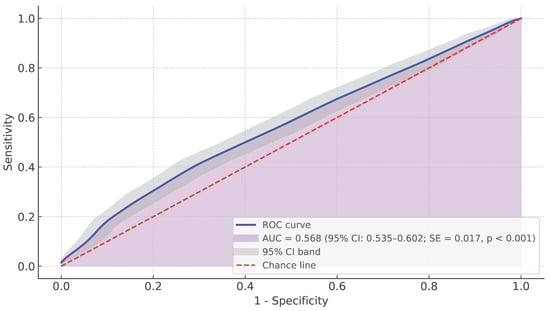 The ROC curve analysis demonstrated a limited ability of the HDFS to detect the presence of a Fall risk ND among the sample. The AUC was 0.568 (95% CI: 0.535−0.602; SE = 0.017, p < 0.001) (Figure 2), reflecting a fail-level discriminative performance [], only marginally better than chance.