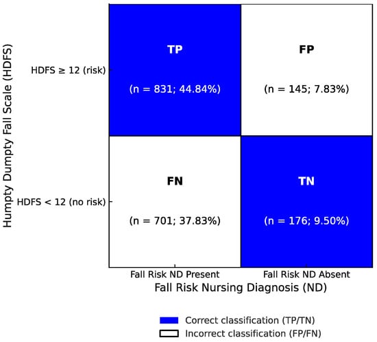 Among the tools used for pediatric fall risk assessment, the Humpty Dumpty Fall Scale (HDFS) is one of the most adopted internationally []. The HDFS considers seven items and—based on a predefined cutoff—classifies patients as either at risk or at low risk for falling. In parallel, NDs related to fall risk—though labeled differently across standard nursing languages such as Clinical Care Classification (CCC) (e.g., Fall risk) and NANDA International (e.g., Risk for child falls)—are identified based on the nurse’s holistic assessment, knowledge of the phenomenon, and clinical experience [,]. Consequently, while the HDFS offers a standardized, quantitative approach to fall risk screening, ND reflects a broader clinical reasoning process and incorporates both clinical and contextual factors—such as patient-specific risks and environmental conditions—that may be missed by structured tools []. However, despite the widespread use of both the HDFS and Fall risk ND, these two approaches are often applied independently in clinical practice [,,]. This siloed application has led to a lack of clarity regarding the level of concordance between the two methods in identifying patients at risk of falls. Specifically, it remains unclear whether the HDFS effectively discriminates those patients whom nurses, based on their clinical expertise, judge to be at risk—formalized through the identification of a Fall risk ND. Addressing this gap is essential, as understanding the alignment—or misalignment—between structured tools and clinical reasoning can inform more consistent and effective fall prevention strategies by enabling more accurate risk stratification and safer patient care.