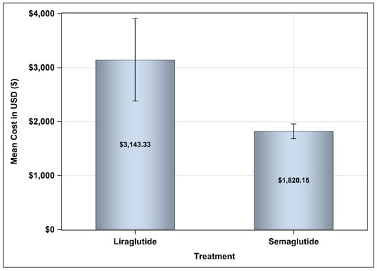 In analyzing the annual pharmaceutical costs associated with GLP-1 receptor agonists, Liraglutide was shown to exceed Semaglutide in terms of expenses, with reported average costs of USD 3143.33 compared to Semaglutide’s more affordable average of USD 1820.15, as illustrated in Figure 1. Additionally, the average annual direct medical cost for Semaglutide stood at USD 4523.16, accompanied by a standard deviation of USD 2176.04. In contrast, Liraglutide’s average annual direct medical costs reached USD 5787.92, featuring a larger standard deviation of USD 4606.97. This indicates a greater variability in total annual direct medical expenses for patients using Liraglutide. The mean difference of USD −1264.76 reflects a significant reduction in costs when opting for Semaglutide, with a 95% confidence interval ranging from −1826.82 to 33.76, as shown in Table 3.