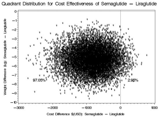 Following a 12-month follow-up period, the average weight reduction demonstrated a significant difference between the two groups. Participants treated with Semaglutide experienced an average weight loss of −8.10 kg, with a standard deviation of ±9.55. In contrast, those on Liraglutide achieved an average weight loss of −5.88 kg, accompanied by a standard deviation of ±9.89. This resulted in a mean difference of −2.22 kg (95% CI: −7.68 to −2.784), indicating that Semaglutide was associated with a greater weight reduction compared to Liraglutide. The likelihood that Semaglutide will result in lower cost and greater weight reduction was 97.05%, as shown in Figure 3. However, there was a 2.95% chance estimated that Semaglutide will result in higher cost and greater weight reduction compared to Liraglutide.