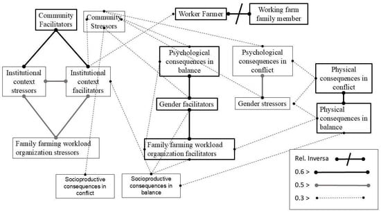 The first set of categories indicates a strong positive correlation between the Gender Facilitators category and Psychological Consequences on Balance (r = 0.633) and with Family Farming Workload Organization Facilitators (r = 0.609). In another set of categories, the Community Facilitators variable showed a strong positive correlation with Institutional Context Stressors (r = 0.650) and Institutional Context Facilitators (r = 0.664). In a third set of categories, the Gender Stressors variable moderately correlates with Psychological Consequences in Conflict (r = 0.540). Finally, Worker Farmer identity correlates negatively with Working Farm Family Member (r = −0.618), while Physical Consequences in Conflict correlates positively with Physical Consequences on Balance (r = 0.667).