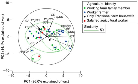 The PCA extracted two main components: PC1, which explained 26.0% of the total variance, and PC2, which accounted for 14.1%. PC1 was shaped predominantly by institutional context facilitators (loading = 0.461) and institutional context stressors (loading = 0.441), while family farming workload organization facilitators loaded negatively (−0.400), reflecting a continuum from institutional support to reliance on internal family structures. PC2 was influenced by community stressors (loading = 0.444) and gender facilitators (loading = 0.382), forming a vertical axis from community-based pressure to gendered coping strategies.