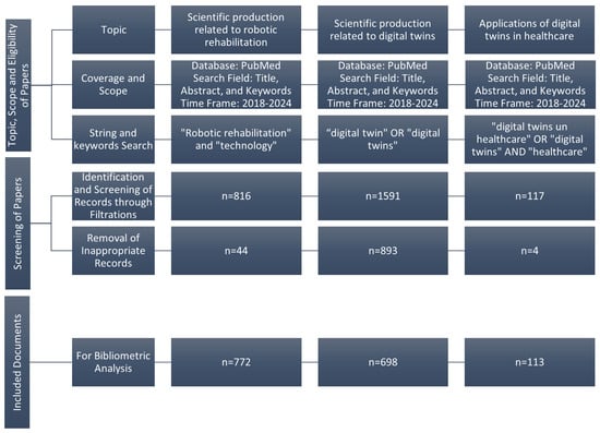 To understand the research field and recent developments, we performed a bibliometric analysis covering the period from 2018 to 2024. Our primary focus was on two main areas: Rehabilitation Robotics and Technology and Digital Twins (DTs). We also conducted a targeted examination of DTs in healthcare to assess their evolving role in medical research and clinical practice.