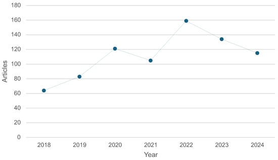 Annual scientific production related to rehabilitation robotics and technology from 2018 to 2024.