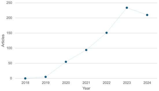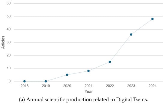 Annual scientific production related to digital twins from 2018 to 2024. The chart shows a rapid increase in the number of articles starting around 2020, reflecting a growing interest and research focus on digital twin technology.