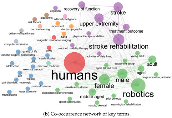 Current DT and AI research in the healthcare sector is characterized by a strong human-centric orientation, addressing specific challenges in rehabilitation, diagnosis, and response to health emergencies. As the co-occurrence network in Figure 6b shows, the high frequency of terms such as humans, men, women, adults, and age underlines the importance of tailoring interventions to population demographics. The prevalence of stroke as a primary focus area, along with function recovery and upper extremity, highlights the priority of restoring functional independence for patients. In this area, AI-driven robotics is emerging as a transformative tool for rehabilitation, enabling intensive and personalized therapies. By modeling the progression of recovery, DTs facilitate the simulation of robotic rehabilitation protocols and the optimization of individual outcomes.