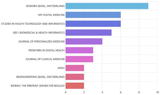 We further used Bradford’s Law to identify core journals involved in DTs and the healthcare field. As seen in Figure 7, Sensors ranks highest, followed by NPJ Digital Medicine, Studies in Health Technology and Informatics, IEEE Journal of Biomedical and Health Informatics, and Journal of Personalized Medicine. This reflects a cross-disciplinary interest spanning sensor technology, health informatics, and personalized healthcare solutions.
