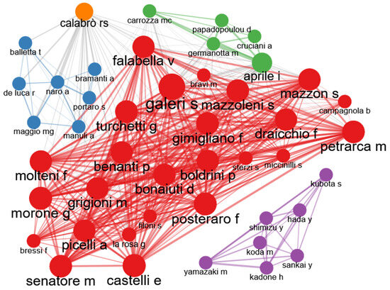 Collaboration network among the authors identified in the development of digital twins for rehabilitation.