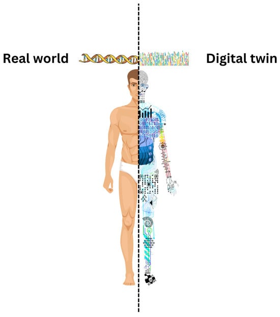 Digital Twins (DTs) are becoming a cornerstone tool within healthcare systems. Their increasing adoption stems from the integration between large-scale data collection and predictive/diagnostic analytics, with both powered by Artificial Intelligence (AI) algorithms. These DTs provide a dynamic and evolving representation of a patient’s state, consistently synchronizing information with cloud-based platforms. Their scope is extensive and encompasses diverse physical, mechanical, and chemical variables of both individuals and the devices interacting with them. Human Digital Twins (HDTs) exemplify this approach by modeling not just physiological parameters but also psychological factors, creating a multifaceted view of human health [30]. These DTs are fed by sensors and biosensors that measure vital parameters, organ functionality, and mobility, among other indicators, then transmit them to a virtual model [31], as shown in Figure 9. In this way, clinicians can detect inherited genetic risks or interpret otherwise “normal” laboratory results in the context of behavioral data, enabling more accurate and timely diagnoses.