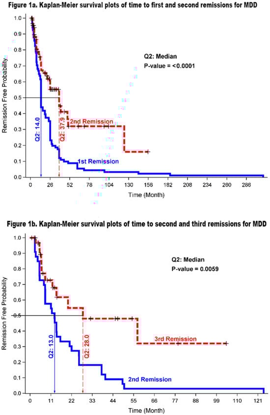 Figure 1a,b show the survival curves for the time in months to the first, second, and third remission of an MDD. The remission time from having the first episode of an MDD was significantly shorter than the remission time from having the second episode of an MDD (medians: 14.0 vs. 37.9 months, p < 0.0001). Of those who had at least three episodes, the second remission happened much sooner than the third remission (medians: 13.0 vs. 28.0 months, p = 0.006).
