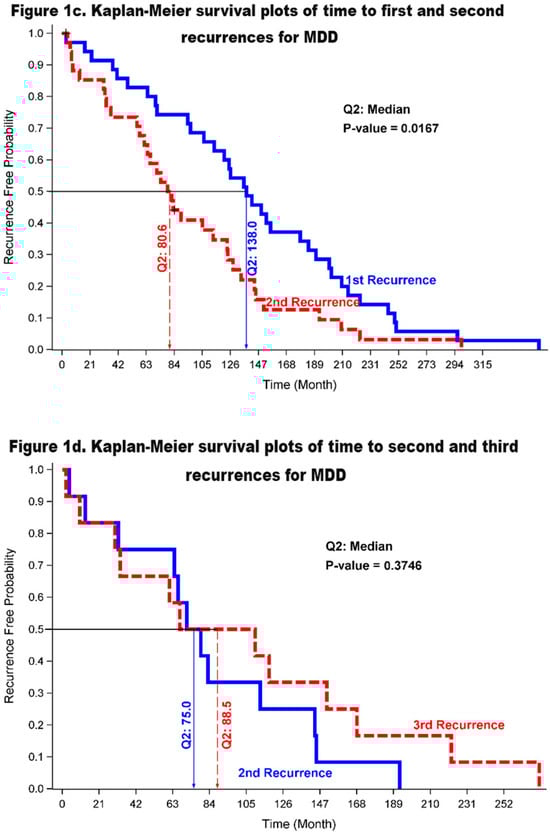 The Kaplan–Meier survival curves illustrating the length of first, second, and third recurrence of MDD are depicted in Figure 1c,d. As evident in Figure 1c, the median time to the second recurrence was significantly shorter than the median length of first recurrence (80.6 vs. 138.0 months; p = 0.017). In comparison, Figure 1d shows no significant difference between the median duration of second and third recurrences (75.0 vs. 88.5 months; p = 0.375), a finding that may be due to the small sample size.