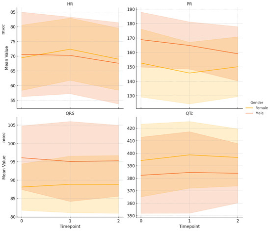 As shown in Table 2, subsequent analyses examined the main electrocardiographic changes between baseline (T0) and the final follow-up (T2) in male and female participants separately, using paired t-tests. In the male group, a statistically significant reduction in heart rate was observed from T0 to T2, with a mean difference of −3.02 bpm (p < 0.05). A significant shortening of the PR interval was also noted within this timeframe, with a mean reduction of −9.80 ms (p < 0.01). No significant variation was found in QRS duration (−0.84 ms, n.s.). Although the QTc interval showed a slight mean increase of 1.62 ms, this change was not statistically significant (p = n.s.). Among female participants, no ECG parameter showed a statistically significant change from baseline to late follow-up. Heart rate remained essentially stable, with a mean change of −0.49 bpm (p = 0.51), and the PR interval showed a modest, non-significant reduction of −2.56 ms (p = 0.51). Likewise, the minor variations observed in QRS duration (+0.72 ms, n.s.) and QTc interval (+2.47 ms, n.s.) were not statistically significant.