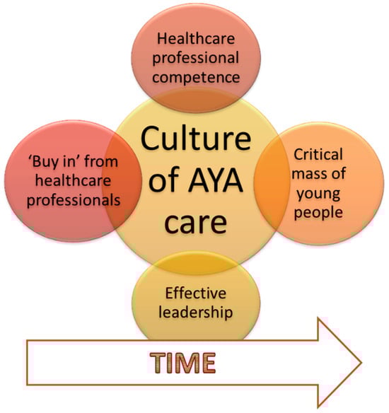 - Lea, S.; Taylor, R.; Gibson, F. Developing, Nurturing, and Sustaining an Adolescent and Young Adult-Centered Culture of Care. Qual. Health Res. 2022, 32, 956–969. [Google Scholar] [CrossRef] [PubMed]