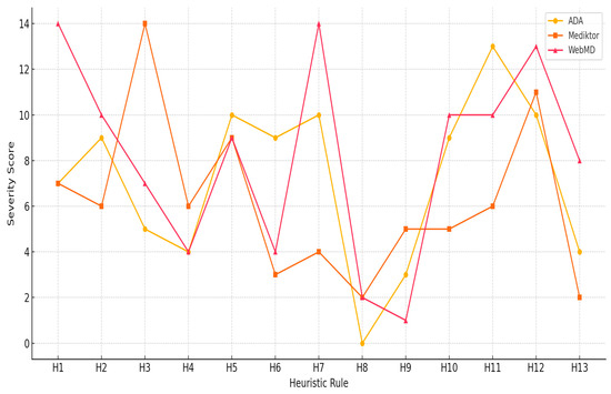 Figure 2 illustrates notable distinctions in heuristic severity across the three evaluated mHealth applications. ADA demonstrated the highest severity scores in Transparency and Explainability (H11) and User Expectations (H12), indicating substantial challenges related to AI communication and user trust. Mediktor, on the other hand, revealed critical issues in User Control and Freedom (H3) and Error Prevention (H5), reflecting concerns with navigation and input validation. WebMD displayed consistently high severity in AI Explainability (H11–H13) and Recognition and Recall (H6), suggesting deficiencies in conveying automation processes and supporting personalized interactions. This comparative visualization provides a clearer understanding of the most problematic heuristics in each application and informs prioritization for future design improvements.