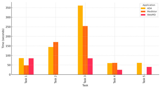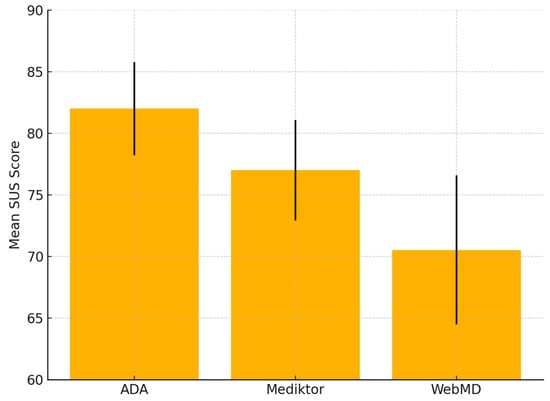 As shown in Figure 7, ADA achieved the highest mean SUS score (M = 81.29), followed by Mediktor (M = 76.51), and WebMD (M = 70.61). The standard deviations are visually represented as error bars.