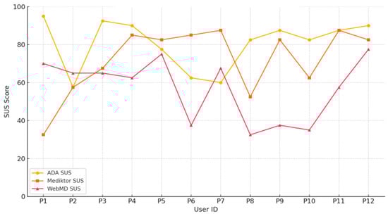 System Usability Scale (SUS) scores per user across ADA, Mediktor, and WebMD.