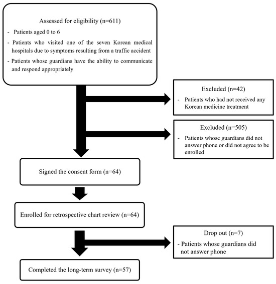 Among the patients aged 0–6 years who visited the Jaseng Hospital of Korean Medicine (Gangnam, Gwangju, Daejeon, Bucheon, Bundang, Ulsan, and Haeundae) for outpatient or inpatient treatment after a TA injury from 1 January 2019 to 30 June 2023, a total of 611 patients were considered eligible according to the inclusion/exclusion criteria. After excluding 42 patients who did not receive KM treatment and 505 patients whose guardians did not answer phone or disagree to be enrolled, 569 were eligible for the survey. Of these, the guardians of 64 patients provided their consent for the use of EMR data and survey participation. Finally, a total of 57 respondents completed the questionnaires (Figure 1). The surveys were conducted from 5 February 2024 to 8 October 2024. For variables from EMR, only patients with available data were included in the analysis, and the number of patients was reported accordingly for each outcome.