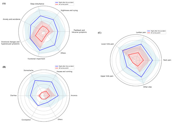 Changes in numerical rating scale (NRS) scores for psychological and digestive symptoms and musculoskeletal pain are investigated using the survey data. (A) Psychological symptoms; (B) digestive symptoms; (C) musculoskeletal pain. The NRS score at the time of the accident is marked in blue, while the NRS score at the time of the survey is marked in red. The shaded area represents the 95% confidence interval.