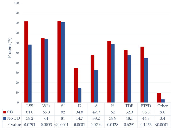 Distribution of psychosocial stressors by cognitive dysfunction. Abbreviations: A, anxiety; CD, cognitive dysfunction; D, depression; H, hostility; LSS, low socioeconomic status; Other, other mental disorders; PTSD, post-traumatic stress disorder; SI, social isolation; TDP, type D personality; and WFs, work and family-related stress.