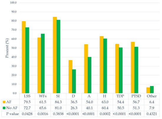 Distribution of psychosocial stressors in patients with cognitive decline according to the presence or absence of atrial fibrillation. Abbreviations: A, anxiety; AF, atrial fibrillation; CD, cognitive dysfunction; D, depression; H, hostility; LSS, low socioeconomic status; Other, other mental disorders; PTSD, post-traumatic stress disorder; SI, social isolation; TDP, type D personality; and WFs, work and family-related stress.
