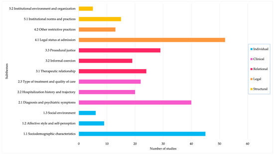 The extracted data were coded inductively using Excel software, with codes generated according to the specific factors presented in the literature as associated with perceived coercion. These initial codes were organized in a table to facilitate comparison and synthesis. Following this, broader categories (or themes) were developed by grouping related codes together based on similarities in content or underlying concepts. For example, codes referring to aspects such as age, gender, or education were grouped under a broader category labeled “Sociodemographic”, while codes referring to communication or therapeutic alliance were grouped under “Relational Factors”. The categorization process was iterative and informed by current literature on coercion as well as the research team’s knowledge on the subject of interest. Specifically, we sought to capture how the identified factors related to perceived coercion at different levels (individual, clinical, relational, legal, and structural). Miles et al.’s (2020) content analysis method was followed to structure this process, ensuring that the themes faithfully represented the range of factors as they emerged from the literature [31]. A detailed example of this categorization is provided in Supplementary Table S3. Reviews were considered but excluded from the results if they did not contribute new information, in order to avoid repetition of data. All reviews are presented in Table 2, but only two reviews were included and considered in the results. The preliminary results were presented to the reviewers with lived professional, academic, and personal experiences and discussed through two separate meetings. Their input was considered and incorporated in the final results.