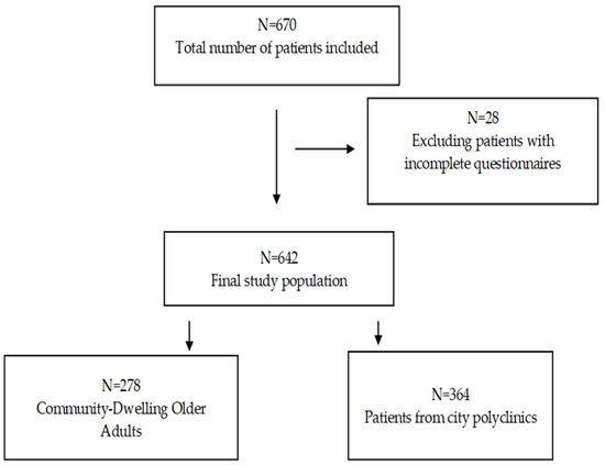 This cross-sectional study was conducted in several polyclinics and geriatric service care centers in two cities (Almaty and Aktobe) of Kazakhstan from March to May 2024. A total of 670 respondents were interviewed. After excluding individuals with incomplete questionnaires (n = 28), the final number of participants was 642 (Figure 1). All respondents were interviewed by geriatricians and general practitioners using questionnaires that included the BI, the simple frailty questionnaire (FRAIL scale), the Mini Nutritional Assessment (MNA), The Strength, Ambulation, rising from a Chair, Stair Climbing, and History of Falling Questionnaire (SARC-F), the Mini-Cog, and the Fracture Risk Assessment Tool (FRAX). Body mass index (BMI) and grip strength were also measured. The participants were recruited from among all patients eligible for inclusion living in a medical or social institution (n = 278). In the city polyclinics of Almaty and Aktobe, patients who came to a general practitioner’s appointment from March to May 2024 were recruited (n = 364). These medical institutions were selected based on the place of work of the main researchers. All patients were familiarized with the study and signed an informed consent form.