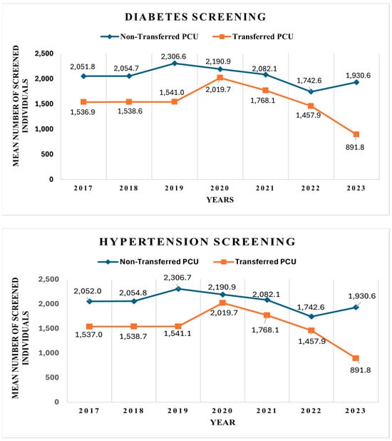 Table 2 and Figure 1 display the mean number of individuals screened for diabetes and hypertension between 2017 and 2023.