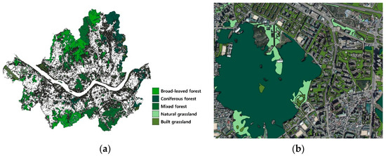 Land cover map for different vegetation types. (a) Spatial distribution of different types of urban green spaces in Seoul, categorized into broad-leaved forest, coniferous forest, mixed forest, natural grassland, and built grassland, based on vegetation structure. (b) A detailed view of green space type overlaid on a high-resolution aerial map.