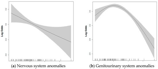 The associations between exposure to green space and each CA are presented in Table 3. According to the results of the GEE model, total green space and forests were not associated with any CA. However, for every 10% increase in grassland, the odds of nervous system anomalies (adjusted odd ratio [aOR]: 0.77, 95% CI: 0.63–0.94) decreased by 23% and the odds of genitourinary system anomalies (aOR: 0.83, 95% CI: 0.71–0.97) decreased by 17%. While not statistically significant, a trend toward decreased odds was observed in other types of CAs as well as overall CA. Subgroup analysis by sex showed significant associations for the nervous system (aOR: 0.74, 95% CI: 0.59–0.97) and genitourinary system anomalies (aOR: 0.83, 95% CI: 0.71–0.97 only in male infants (Table S4). However, no significant interaction by sex was found. A GAM including smoothing splines with four degrees of freedom was used to visualize dose–response relationships between grassland and nervous and genitourinary system, which were identified as significant in the GEE analysis (Figure 2). For the nervous system, a linear pattern was observed, while the genitourinary system exhibited a non-linear, inverted U-shape pattern.
