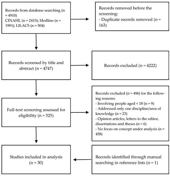 A total of 4910 publications were identified through the database search, of which 163 were excluded for being duplicates (see Figure 1); 4222 articles were excluded after screening titles and abstracts. Thus, 525 articles were carefully read to determine their eligibility. From these, 496 articles were eliminated, leaving 29 articles that were included in the final sample. One further article was obtained by examining the reference lists of the papers. The final sample included 30 articles (Supplementary Table S1).