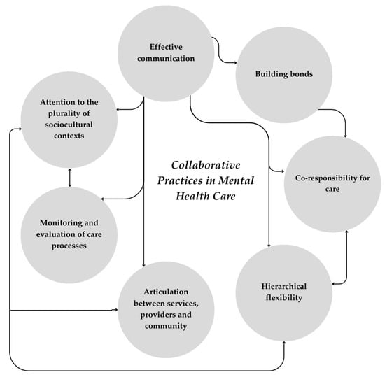 Collaboration in mental health care is a fundamental aspect in achieving this transition between care models. A set of approaches related to Collaborative Practices in Mental Health Care (CPMHC) have been developed in different contexts, considering different components and using different concepts of interdisciplinary and collaborative practice [17]. Some of them are aimed at the integration between professionals specialized in mental health and primary care professionals; others emphasize the relationships between different healthcare disciplines; others value collaboration between healthcare and other sectors, such as education, culture, and social assistance; others address person-centered decision-making; and there are still those that engage and work with communities [18,19,20,21,22,23].