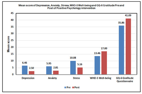 Mean score of depression, anxiety, stress, WHO-5 well-being, and GQ-6 gratitude questionnaire pre- and post-Positive Psychology Intervention.