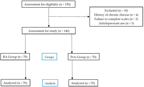 A total of 150 patients diagnosed with either RA or PsA, aged between 18 and 70 years, were initially considered for inclusion. Of these, 10 patients were excluded due to chronic illness (n = 4), early withdrawal before completing assessments (n = 3), or the use of antidepressants (n = 3). The final sample consisted of 140 participants, equally divided into RA (n = 70) and PsA (n = 70) groups (Figure 1).