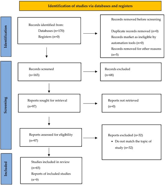 This study adopts a bibliometric review approach to examine the scientific literature on the psychological and organizational impacts of loneliness and isolation in remote work contexts. A total of 65 peer-reviewed articles indexed in Scopus database were analyzed, given Scopus’s recognized comprehensiveness and indexing quality across diverse fields of knowledge [32]. To identify thematic trends and research patterns, bibliometric mapping was conducted using VOSviewer software v.1.6.17 [30,33], which enables the visualization of co-citation networks and keyword co-occurrence, facilitating the identification of research clusters and emerging topics. The review process adhered to the PRISMA (Preferred Reporting Items for Systematic Reviews and Meta-Analyses) guidelines, ensuring methodological transparency and replicability through the sequential steps of identification, screening, and inclusion (Figure 1).