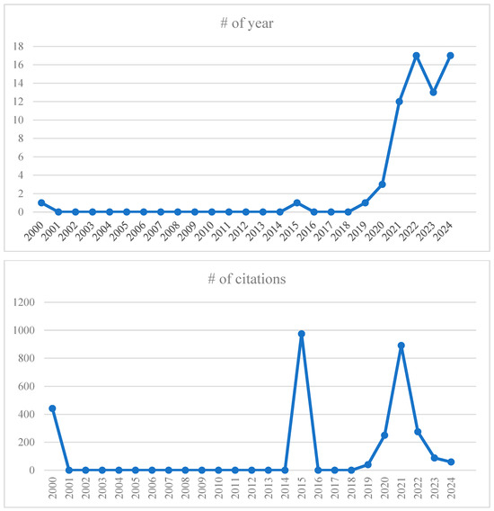 Citation analysis further highlights peaks in academic influence during 2000, 2015, and 2021, with notable citation counts in 2015 (approximately 970 citations) and 2021 (approximately 860 citations). These peaks likely correspond to seminal works that spurred subsequent research activity. Between 2001 and 2013, citation activity was negligible. A steady increase began in 2019, reaching a peak in 2021, followed by a decline in citation volume through 2024, potentially reflecting the lag time between publication and academic uptake of newer studies.