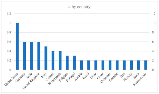 The geographical distribution of the studies analyzed indicates a predominance of research originating from Europe and North America. In total, the 65 reviewed studies span 40 countries, with the United States emerging as the most frequently represented nation (n = 9), followed by Germany, the United Kingdom, and India, each contributing six articles (Figure 3).