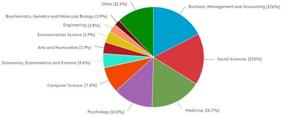 A review of publication outlets shows that Frontiers in Psychology, the International Journal of Environmental Research and Public Health, and the Journal of Occupational and Environmental Medicine each published three of the reviewed articles, leading in terms of publication volume. Table 3 presents the 25 journals with the highest representation in this review, based on data from the Scimago Journal & Country Rank (SJR) and the Journal Citation Report (JCR). The fields of Business, Management and Accounting, and Social Sciences jointly account for the highest share of publications (17.6% each), followed by Medicine (16.7%) and Psychology (13%) (Figure 4).