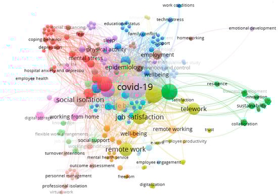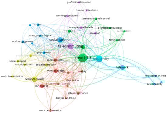 To map the thematic structure of the field, a keyword co-occurrence analysis was conducted. A total of 488 words were identified and grouped into 22 clusters. The most frequently occurring terms were COVID-19, teleworking, social isolation, mental health, job satisfaction, and productivity. As shown in Figure 5, these terms are visualized as larger nodes, indicating higher frequency and stronger interconnections.