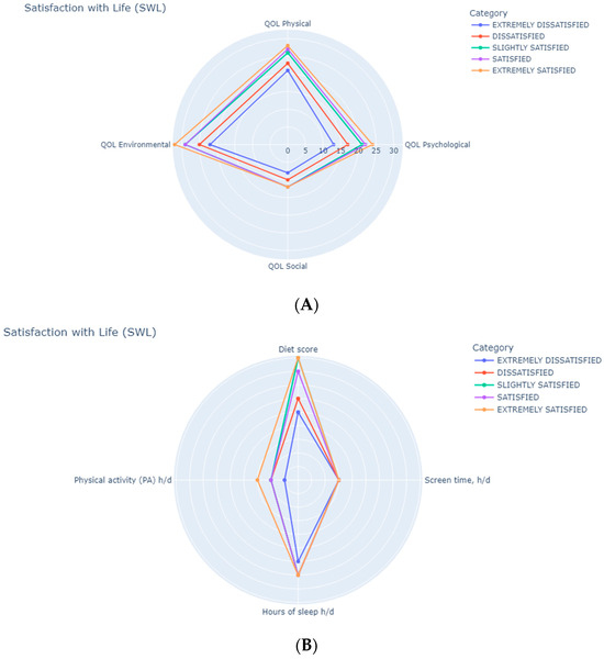 Radar chart showing median values of the association between satisfaction with life and QoL parameters (A), and lifestyle parameters (B).