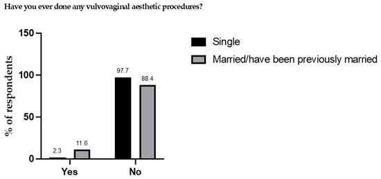 When asked whether they would personally consider undergoing these procedures, most respondents in both groups stated they would not (80.32% of single participants and 81.72% of married or previously married participants) (Table 4). However, married or previously married women showed a higher willingness to undergo vaginal rejuvenation (7.96% vs. 1.99%) and laser vaginal tightening (5.38% vs. 2.71%) compared to single women. Conversely, single women exhibited a greater inclination toward whitening procedures (15.16% vs. 9.68%) (Table 4).