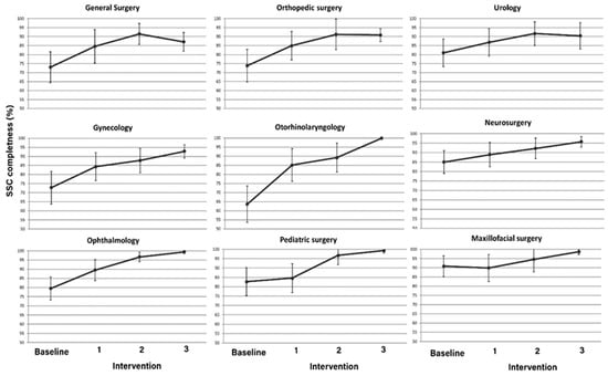 A consistent pattern of improvement in checklist completeness was observed across all surgical departments following the interventions (Figure 1). While certain specialties, such as maxillofacial surgery and neurosurgery, already exhibited high levels of checklist adherence at baseline, others showed marked progress over time. Notably, otorhinolaryngology demonstrated the most substantial improvement, with checklist completeness rising steadily throughout each intervention phase. This department, which started with one of the lowest baseline adherence rates, achieved near-complete compliance by the final phase, reflecting the effectiveness of the implemented measures. Overall, the trend across departments suggests a sustained enhancement in adherence to safety protocols, underscoring the impact of targeted interventions on improving surgical safety culture.