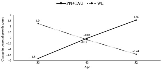 Treatment group differences in personal growth changes moderated by age. Note. PPI = positive psychological intervention; TAU = treatment as usual; WL = waiting list.
