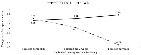 Secondly, given that all participants received individual psychological sessions as part of the TAU component, the analysis revealed differences in treatment responses based on the number of individual psychological sessions per week. Specifically, the PPI + TAU condition was more effective in increasing self-acceptance levels compared to TAU alone when participants attended more weekly therapy sessions (b = 4.49, p = 0.007). The analysis identified specific cut-offs for the number of sessions per week (0.25, 0.50 and 1) at which the experimental treatment began to show a significantly greater effect than TAU (see Figure 2). Notably, attending one session per week significantly increased self-acceptance after treatment.