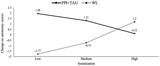 Treatment group differences in autonomy changes moderated by different baseline somatization levels. Note. PPI: positive psychological intervention; TAU: treatment as usual; WL: waiting list.