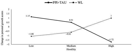 Treatment group differences in personal growth changes moderated by different baseline hostility levels. Note. PPI: positive psychological intervention; TAU: treatment as usual; WL: waiting list.