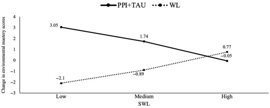 Treatment group differences in environmental mastery changes moderated by different baseline life satisfaction levels. Note. PPI: positive psychological intervention; SWLS: satisfaction with life; TAU: treatment as usual; WL: waiting list.